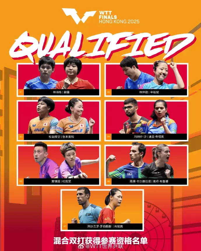 林诗栋/蒯曼、林仲勋/申裕斌、松岛辉空/张本好意思和、玛纳什-沙/迪亚-奇塔莱、黄镇廷/杜凯琹、雨果/高桥-布鲁纳、阿尔瓦罗-罗伯勒斯/肖瑶茜