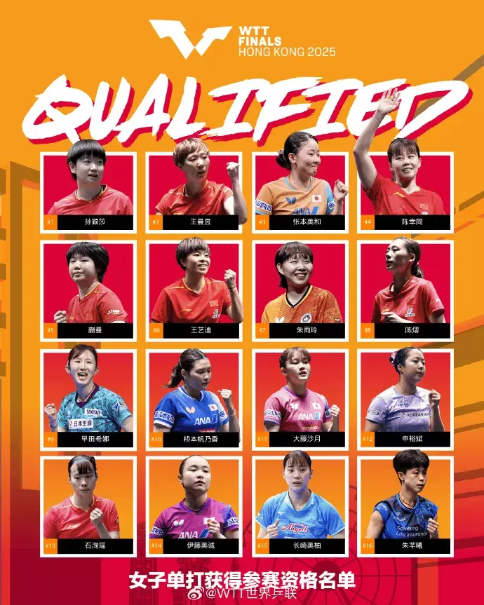 孙颖莎、王曼昱、张本好意思和、陈幸同、蒯曼、王艺迪、朱雨玲、陈熠、早田希娜、桥本帆乃香、大藤沙月、申裕斌、石洵瑶、伊藤好意思诚、长崎好意思柚、朱芊曦