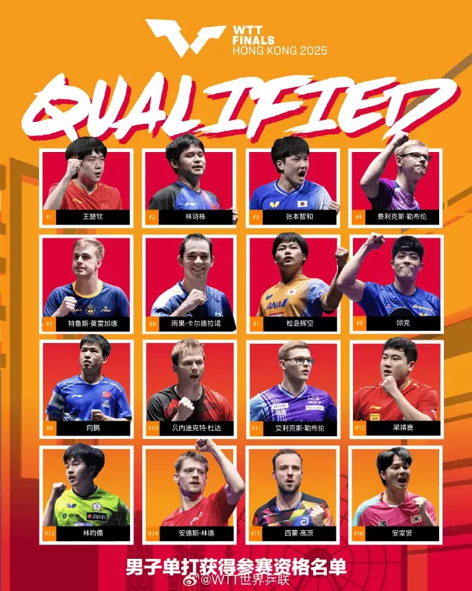 王楚钦、林诗栋、张本智和、费利克斯-勒布伦、莫雷高德、雨果、松岛辉空、邱党、向鹏、杜达、艾利克斯-勒布伦、梁靖崑、林昀儒、安德斯-林德、西蒙-高茨、安宰贤